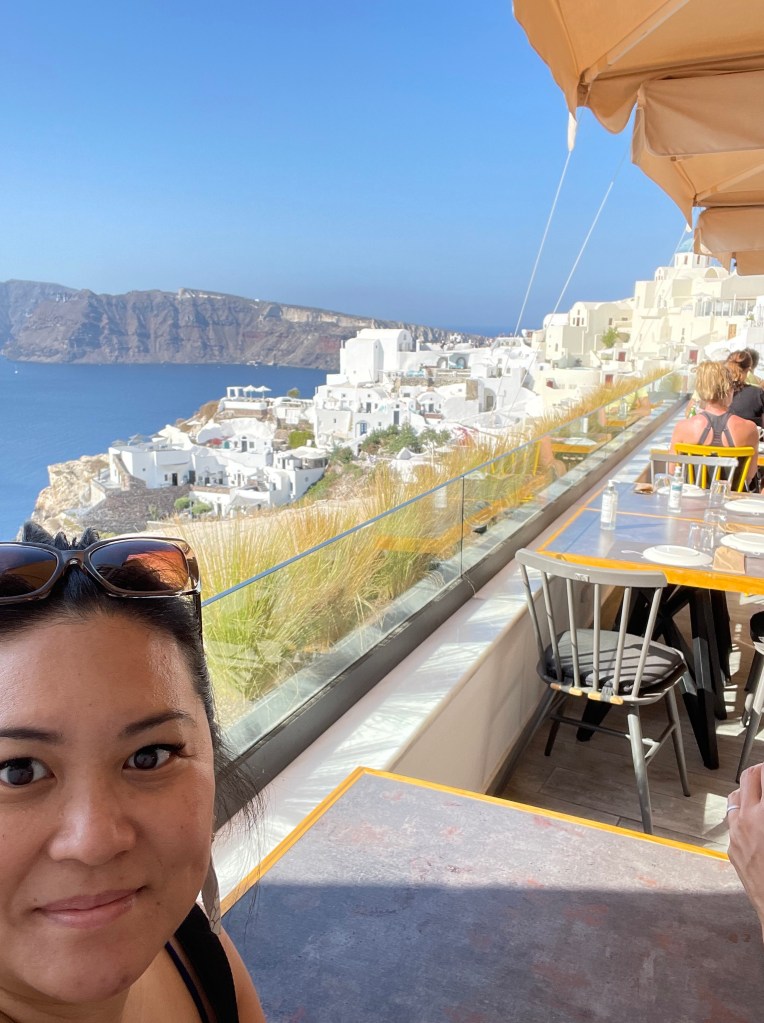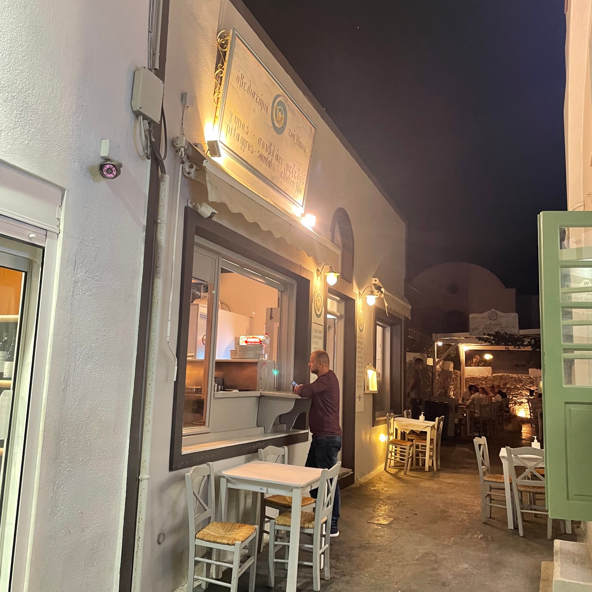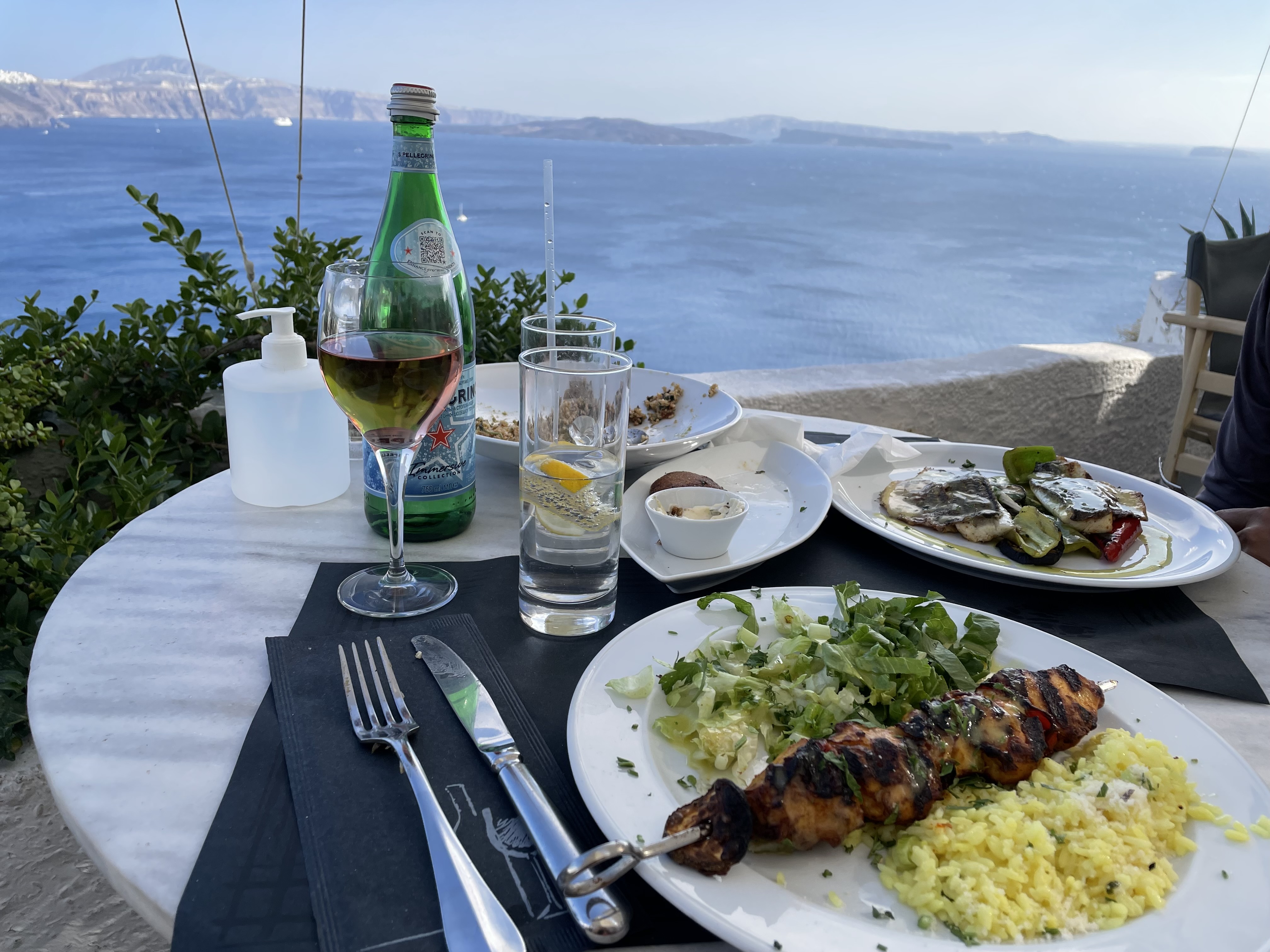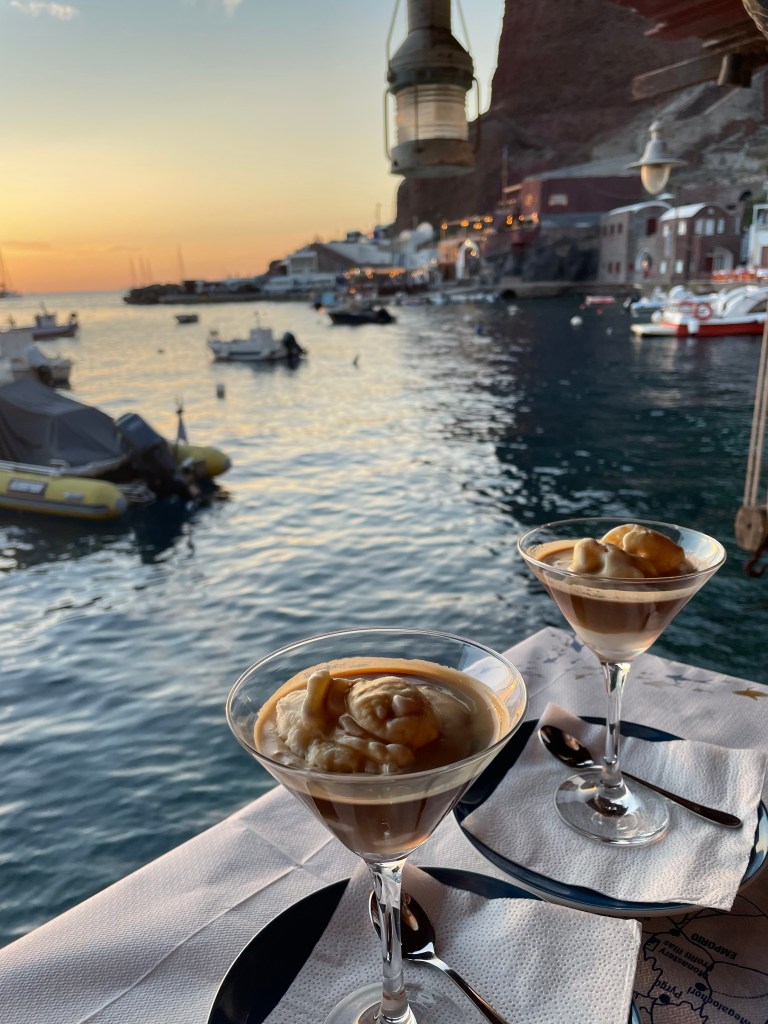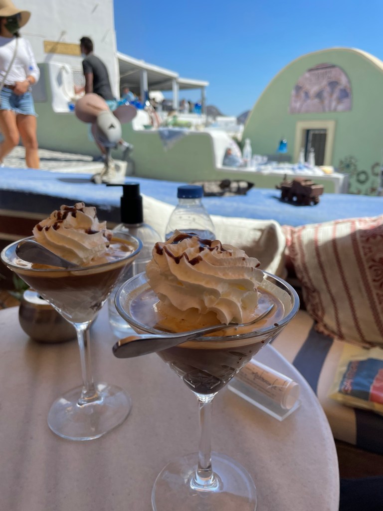 218 cafe – was just so relaxing, the view with some Rose, could have stayed there all day! The food was fine, it was more about the view here and the drinks. They had a good affogato and a cookie. Worth a stop for a drink and dessert. We love the orange pie here in Santorini!