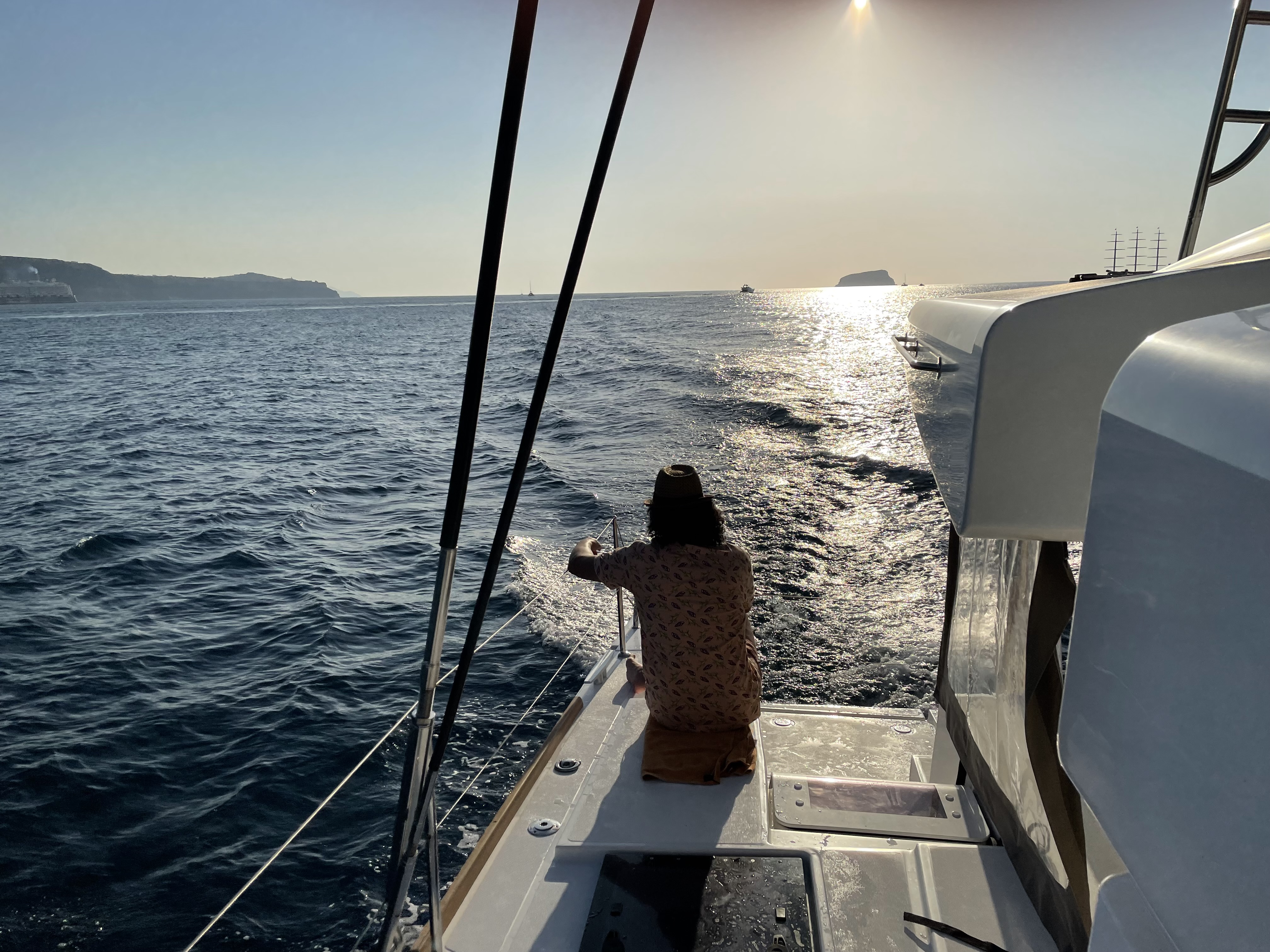 - Santorini Sunset Luxury Sailing Catamaran Cruise with BBQ, drinks, transfer; Pick up outside Atlantis Oia Drive Centre (opposite the Post Office of Oia) at 12:50pm