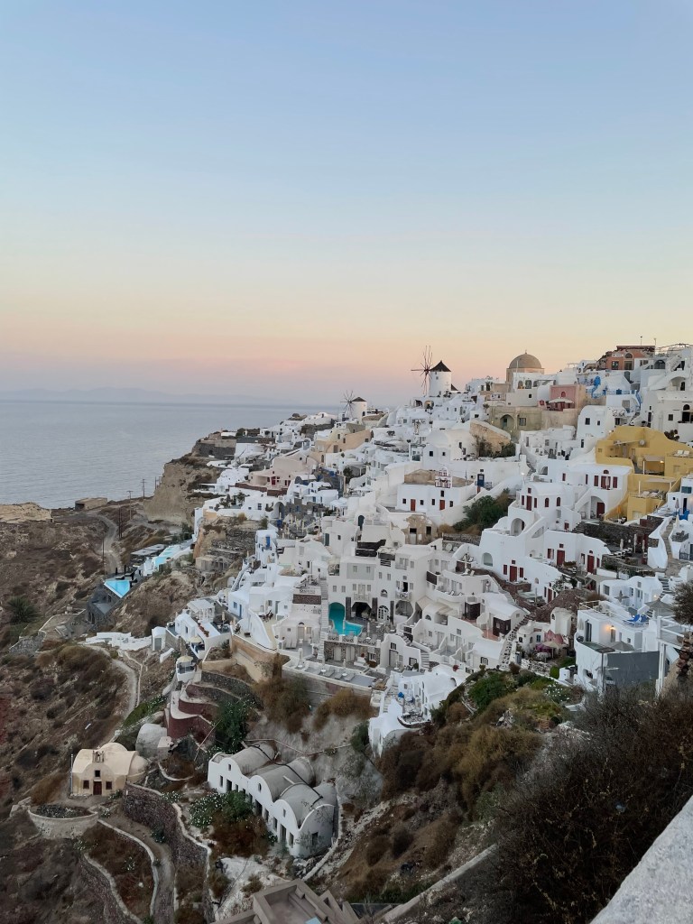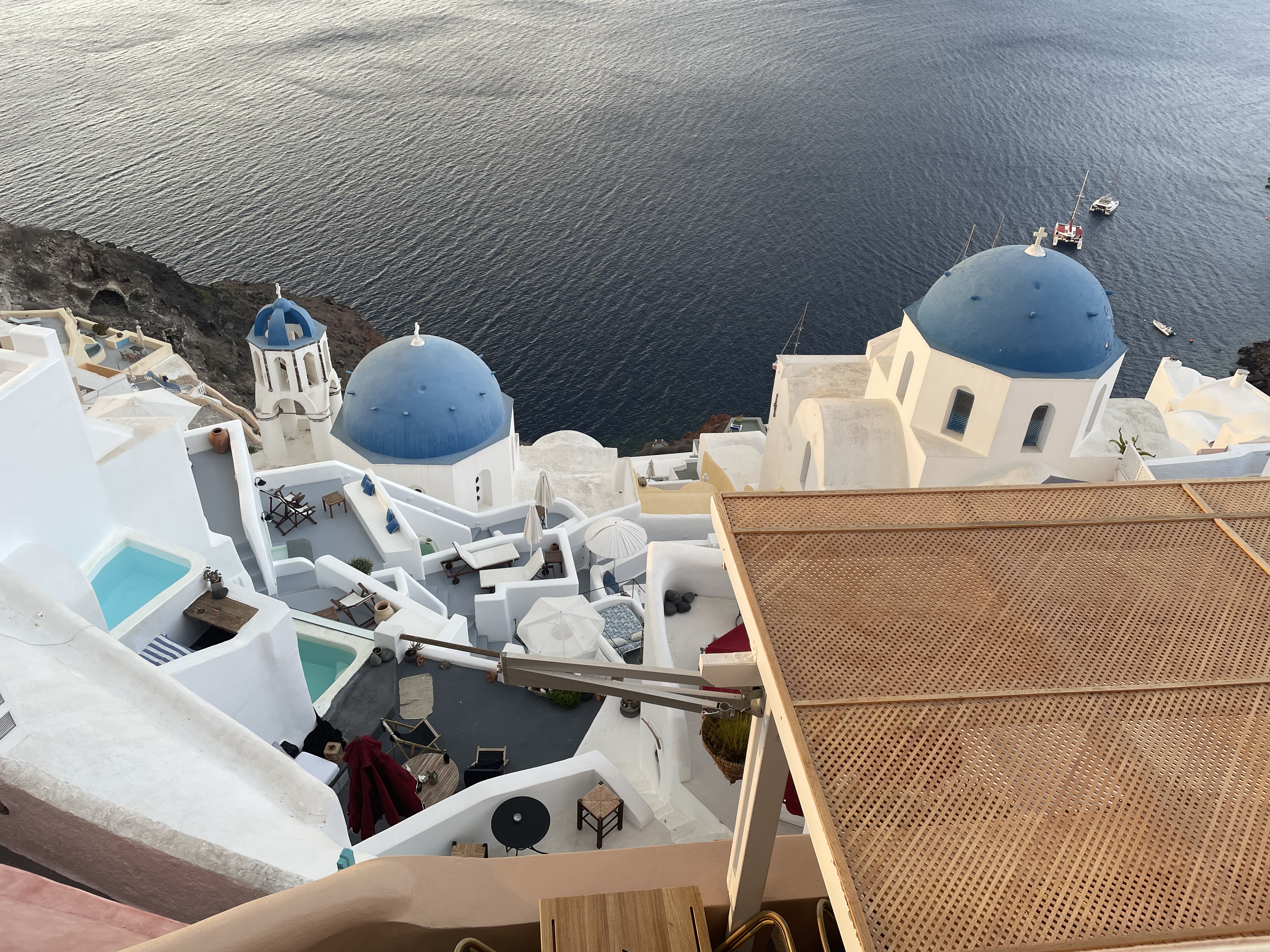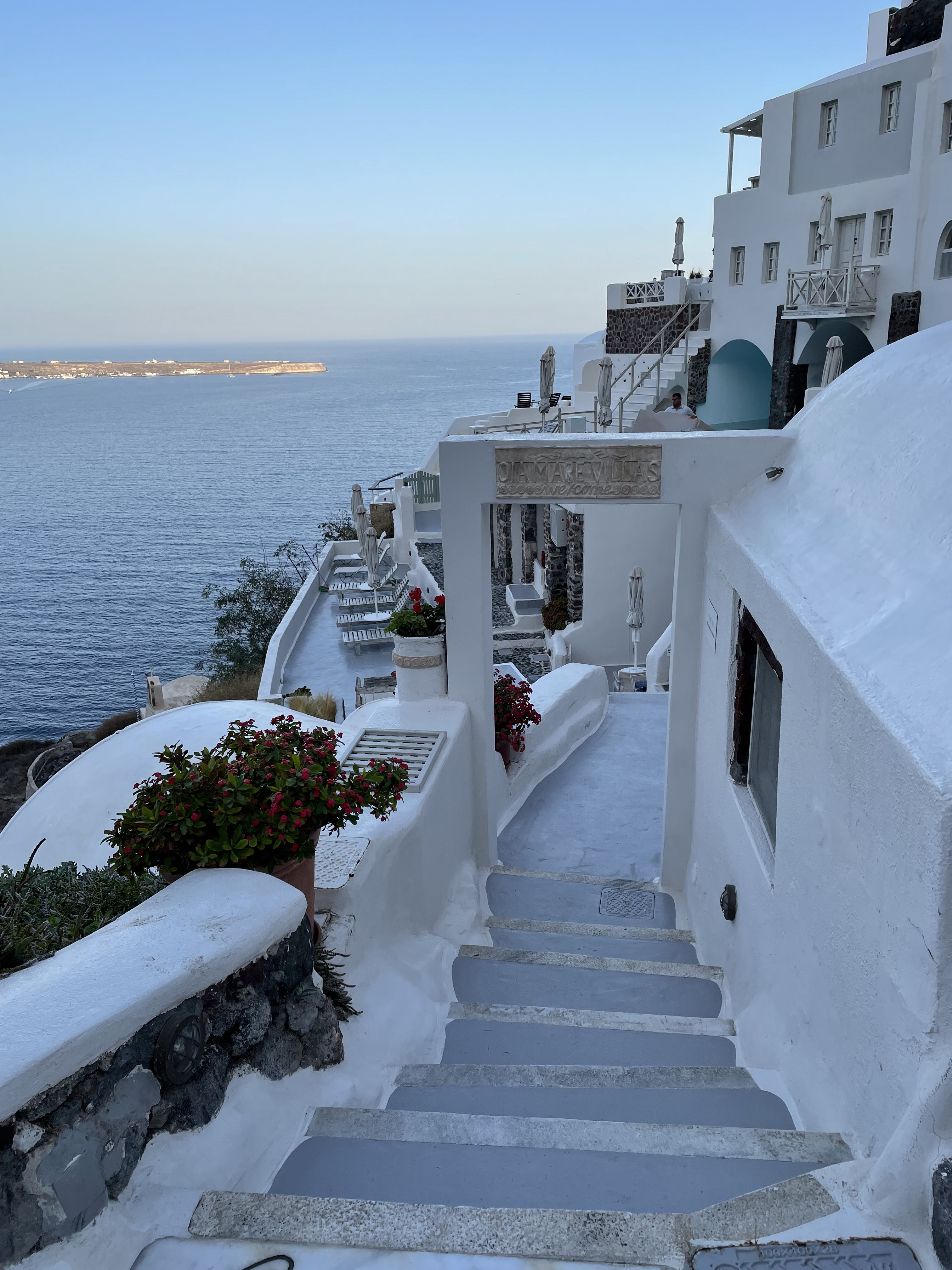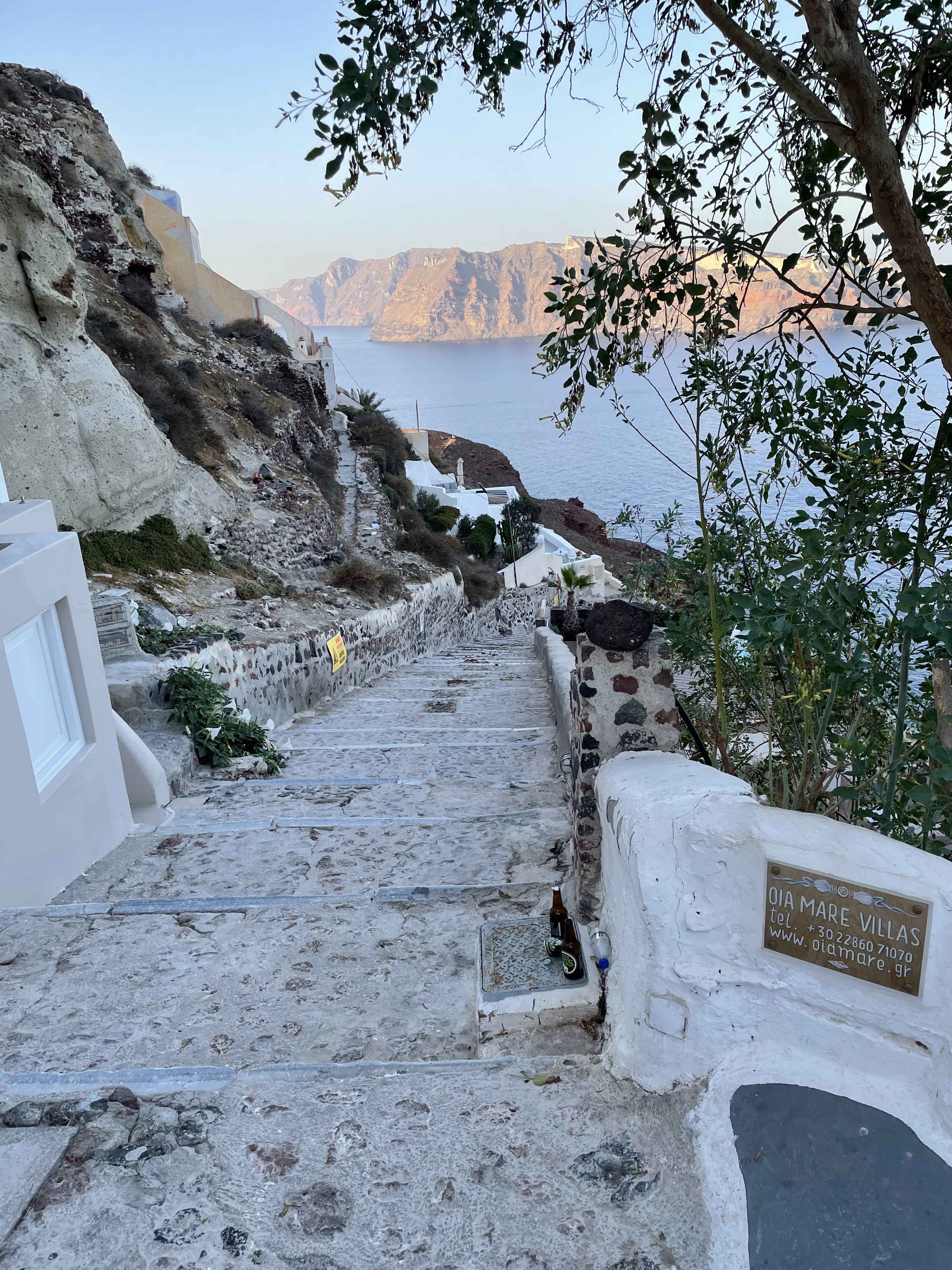 We stayed at the Oia Mare Villas https://oiamarevillas.business.site/ I read many reviews on Expedia and TripAdvisor as I am particular about cleanliness and location. It was the perfect pick I must say! I highly recommend! This isn’t a “you will hardly be in your room” it doesn’t matter where you stay kind of trip. One of the nice things about Santorini is relaxing at your hotel, enjoying the views from your room. We spent mornings and nights out on the balcony just staring out! Loving where you stay plays a huge factor in the overall experience, in my opinion anyway. I saw rooms ranging from $100-$600+, we were right in the middle at $348/night in euros ($400 in dollars) and so worth it! Oia Mare is clean, beautiful, a great location with a very friendly, helpful staff. Quick to reply over email as we prepared for our trip, they set up our transfer from the airport to the hotel with their porter that carried our luggage through the town to our room. Cars/buses drop you off at the main road near the Post Office since the streets are narrow and no cars allowed inside. The location is a short walk from the main road, down the caldera so feels private, but also not too far from all the shops and restaurants. Super easy check in, welcomed with a glass of wine. Anxious to wake up early the next morning to catch the sunrise up at the Oia Castle. Absolutely beautiful!