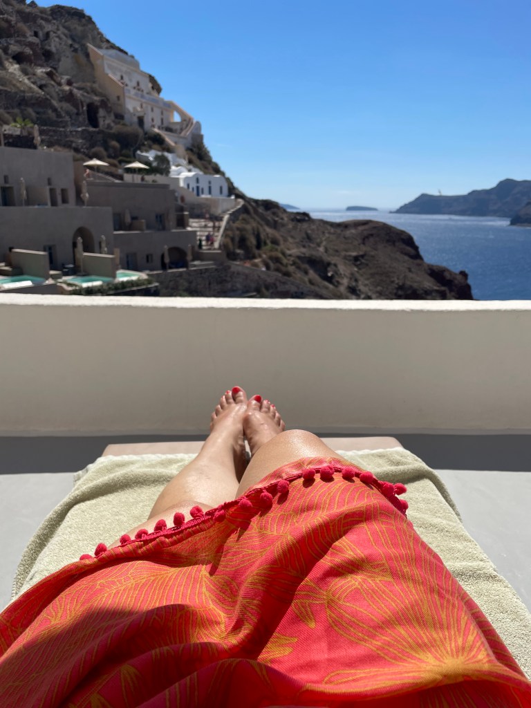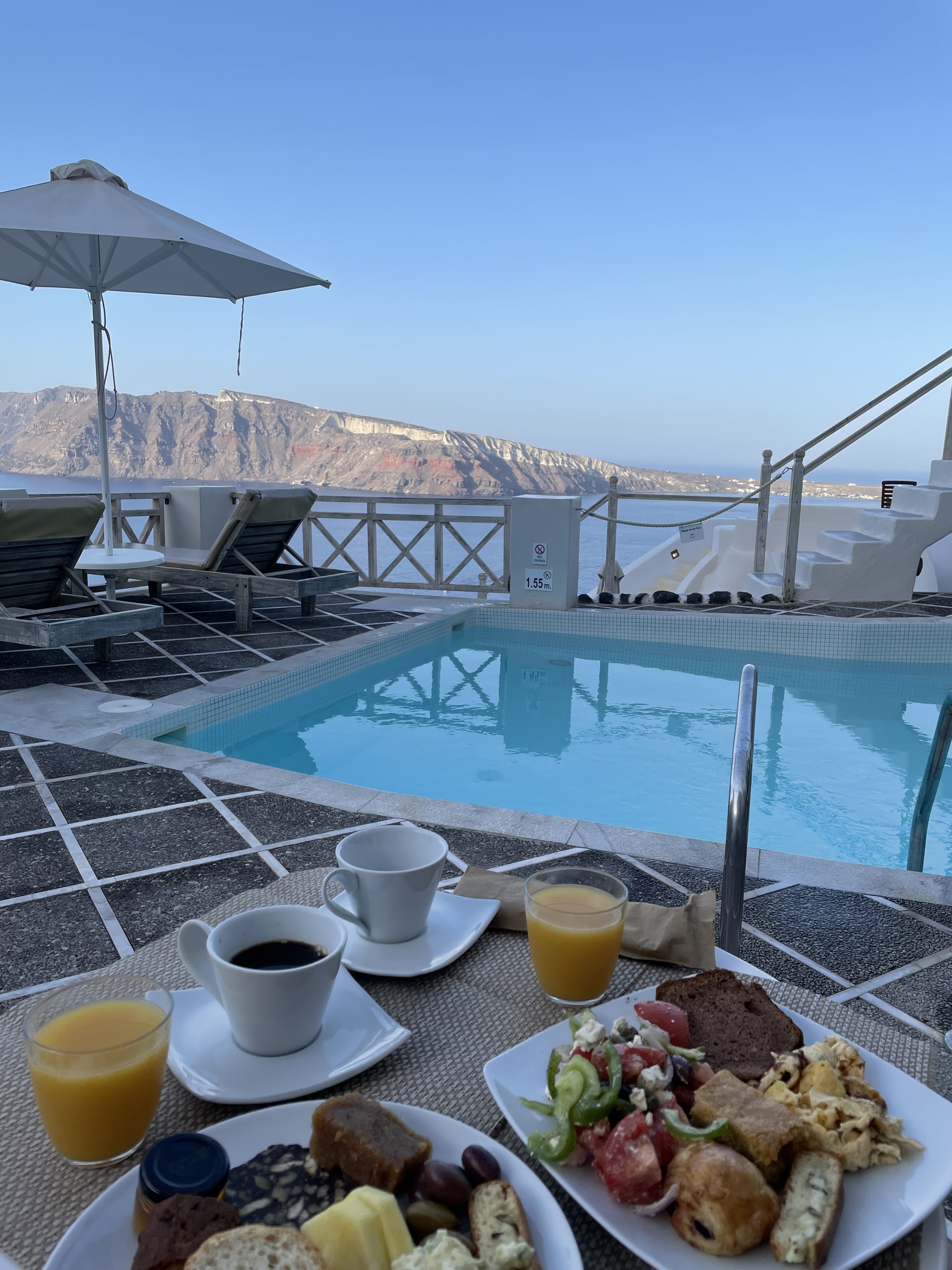 - Rest at Oia Mare – we were going to hang out in Imerovigli for the day but decided to go back and spend the afternoon at our hotel back at Oia Mare. They held our luggage and encouraged us to use all the amenities. They had a nice bathroom and shower for us to use after a day out in the sun. They booked our taxi to Cavo Tagoo for dinner but kept our luggage and brought it with them later when they picked us up at Cavo Tagoo on the way to the airport. Super helpful and convenient!