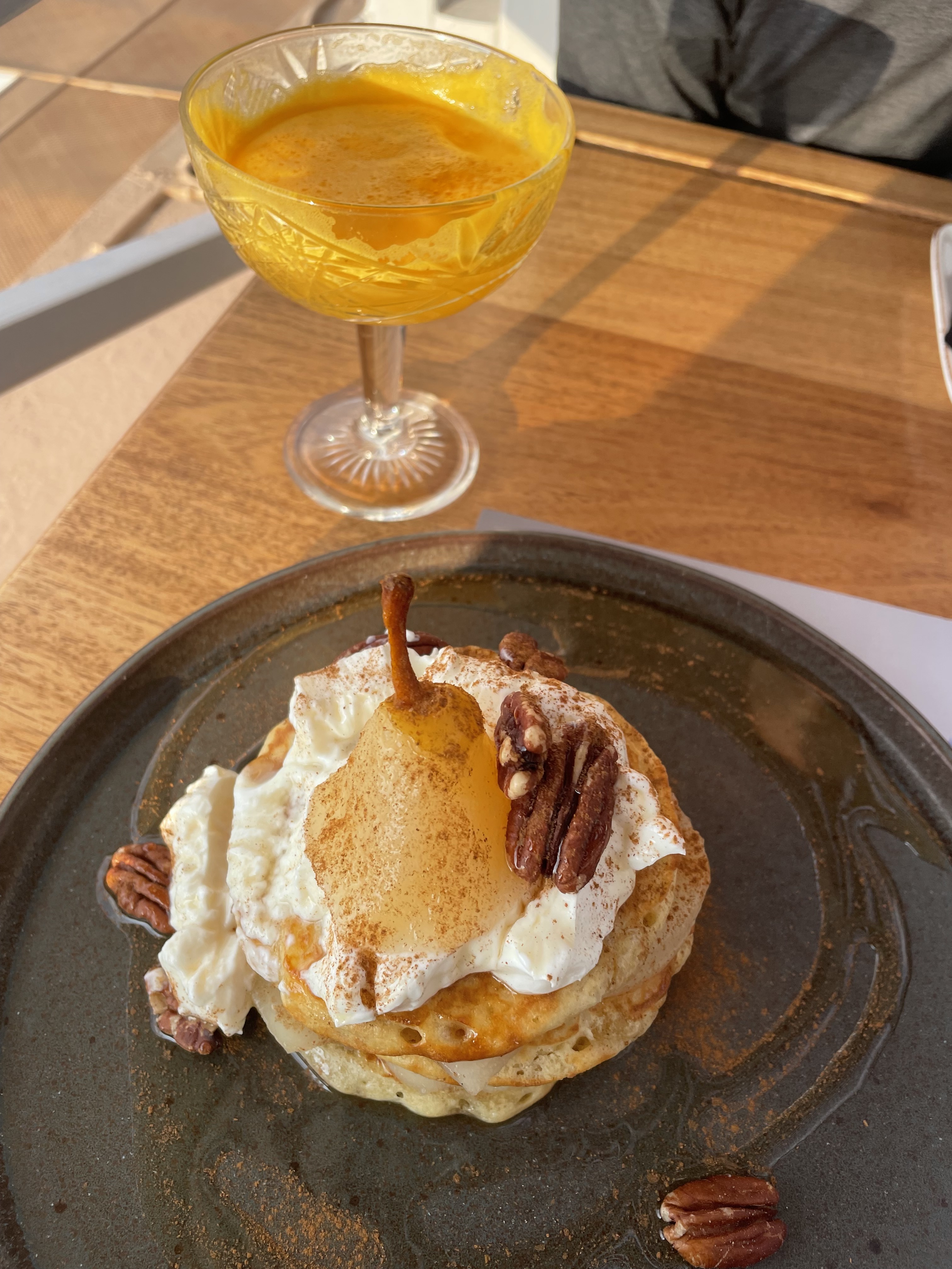 Terpsi – another ahhhmazing view for breakfast! Morning mimosa and since we heard it was Fall already had some pancakes with pears, walnuts and cinnamon.
